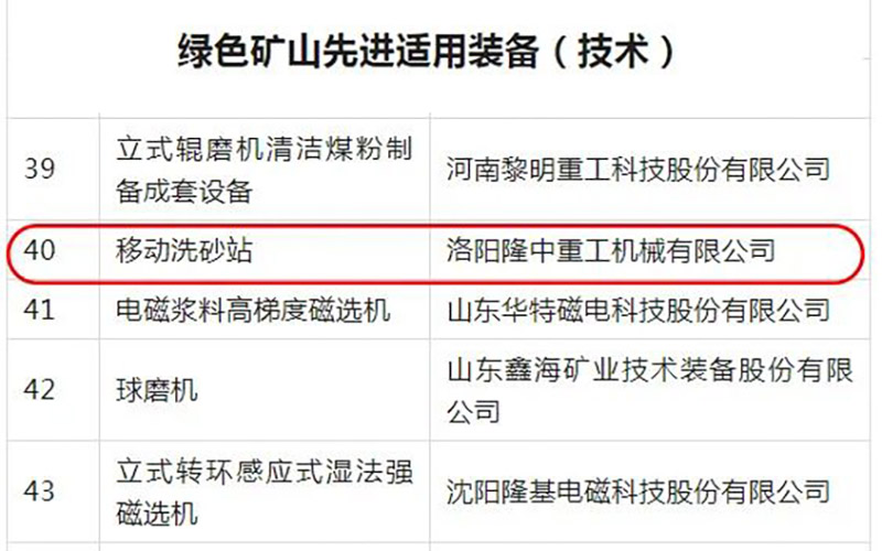 近日,《綠色礦山百項先進(jìn)適用裝備(技術(shù))目錄》***終名單出爐,洛陽隆中重工機(jī)械有限公司的礦山裝備移動洗砂站成功入選目錄名單。